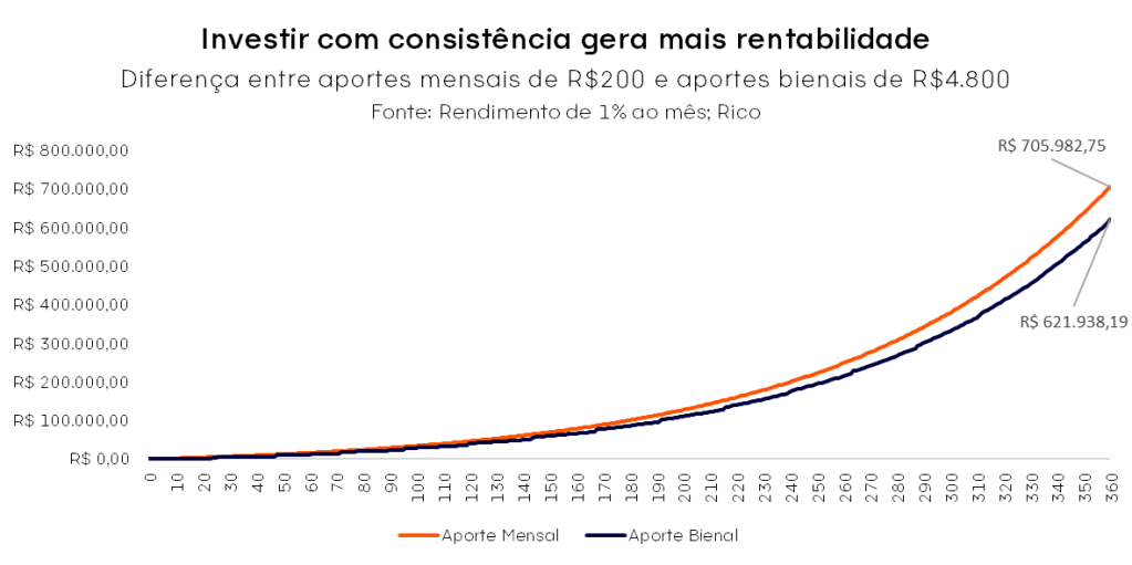 Para colocar à prova, simulamos dois investidores com o mesmo valor total aplicado ao longo de 30 anos. O investidor consistente faz aportes de R$ 200 por mês — todo mês, sem exceção. O investidor casual aplica R$ 4.800 a cada dois anos. No total, ambos colocam exatamente a mesma quantia no mercado. A diferença é só a frequência.