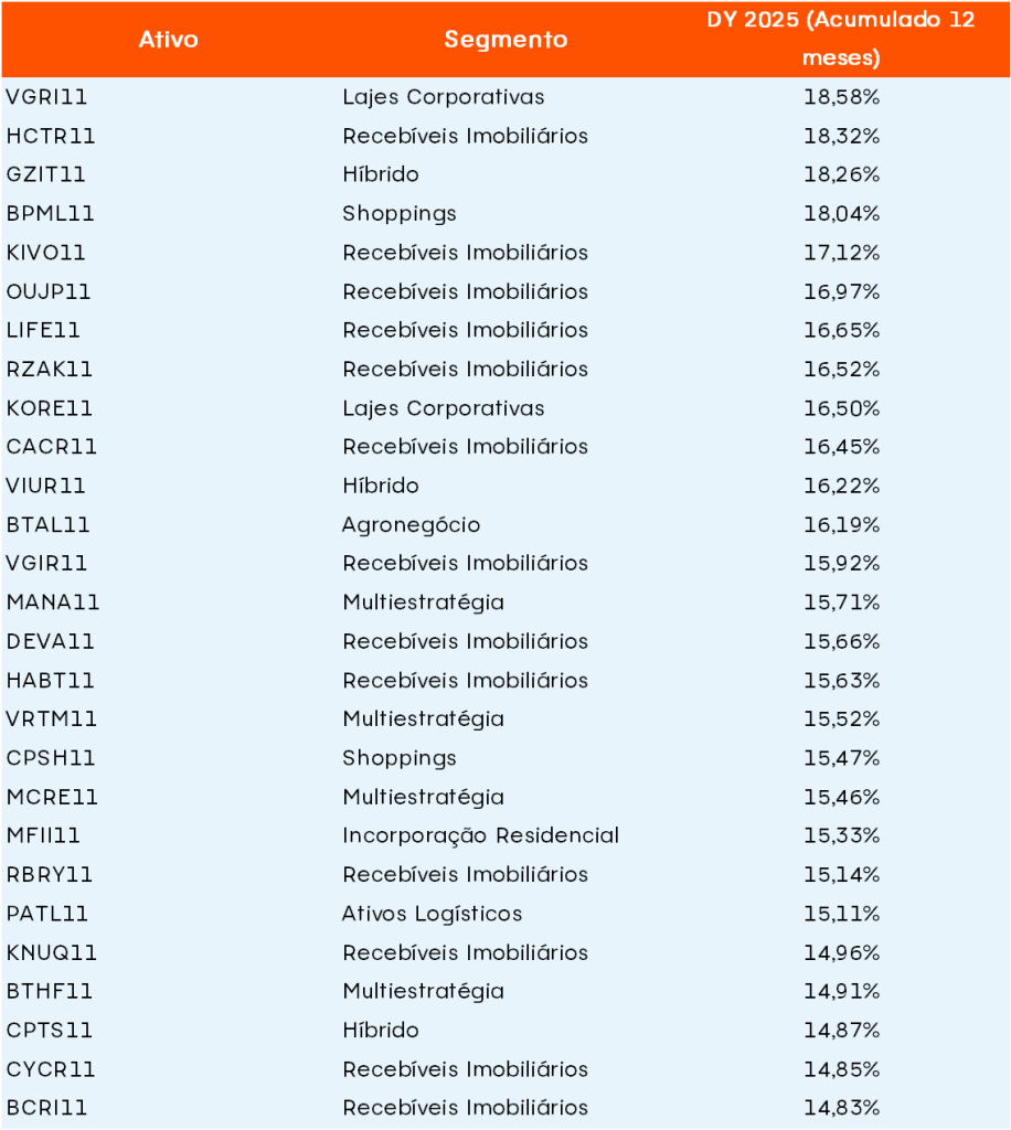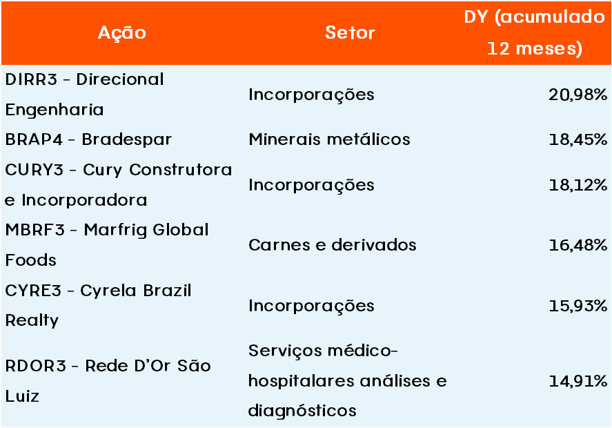 Abaixo, listamos as empresas com o DY acumulado nos últimos 12 meses superior a 14,75% ao ano: