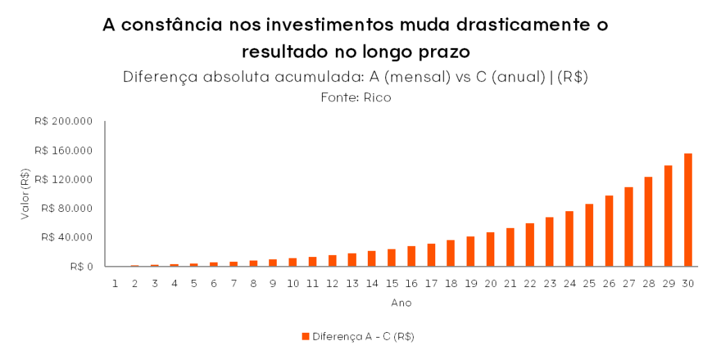 Mesma quantia total, frequência diferente, resultado 13,5% maior. Uma diferença de quase R$ 84 mil gerada não por investir mais, mas por não parar de investir.