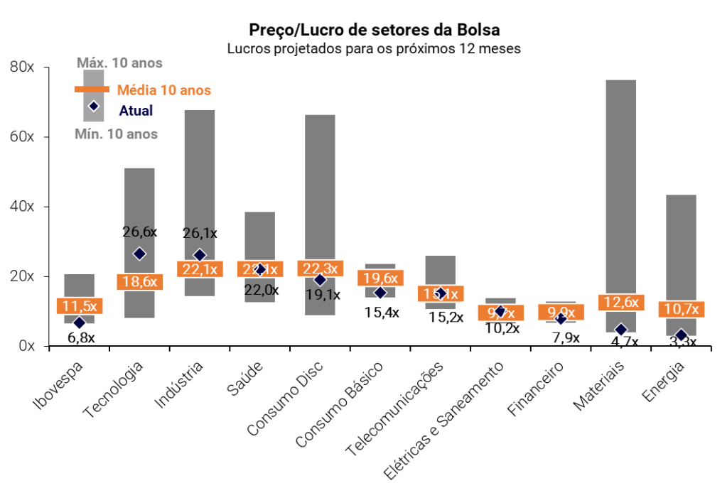 A maioria dos setores do índice Ibovespa negociam com seu indicador P/L próximos ou abaixo de suas médias de longo prazo, com as únicas exceções sendo os setores de Tecnologia e Indústria: