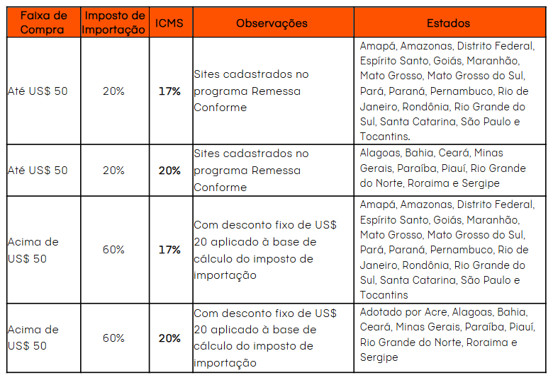 - Compras feitas fora do Remessa Conforme estão sujeitas à alíquota de 60% de imposto de importação e à mesma carga de ICMS (que pode variar entre 17% e 20%, conforme o estado).