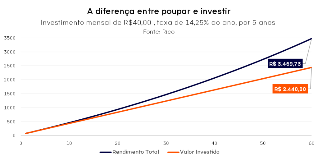 Imagine que, em vez de gastar R$ 40 a mais em cada compra por conta dos tributos, optasse por poupar esse valor mensalmente e aplicá-lo em um título do Tesouro com rendimento médio de 14,25% ao ano. Conforme o gráfico abaixo, em cinco anos, isso se transformaria em aproximadamente R$ 3.469, 72. Ou seja, aquele dinheiro “escondido” nos impostos poderia virar uma reserva para emergências, uma viagem ou até o início de uma reserva financeira.