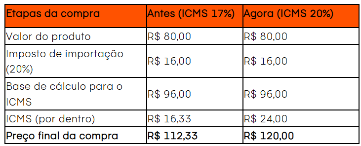 A tabela abaixo mostra como essa dinâmica impacta uma compra de R$ 80, considerando a variação do ICMS entre 17% e 20%: