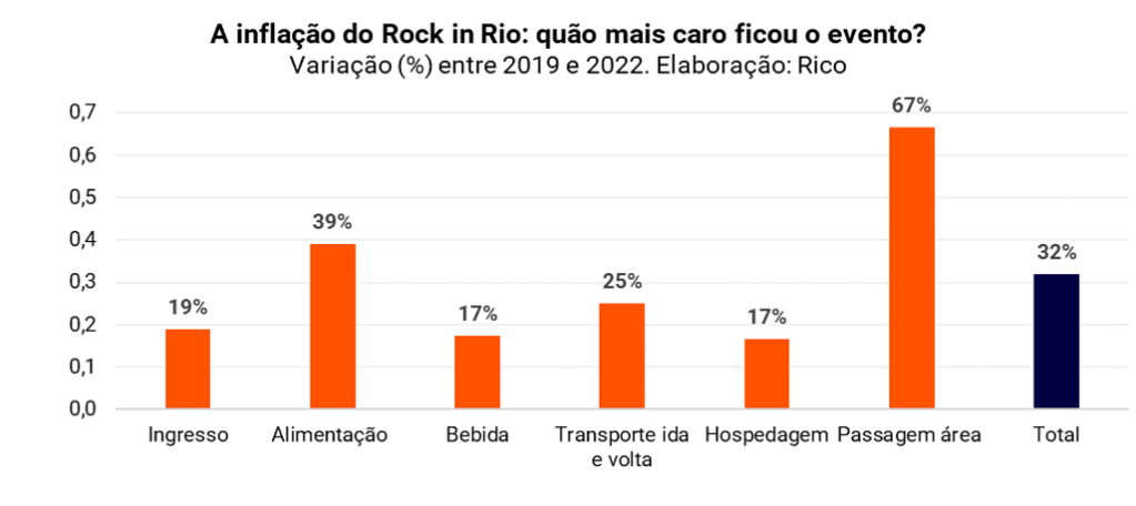 Para se ter uma ideia, enquanto o preço do ingresso (inteira) subiu de R$ 525 na última edição para R$ 625 agora, a passagem de avião SP-RJ, em média, mais do que dobrou de preço. Abaixo, ilustramos a evolução dos principais custos do Rock in Rio, comparando a edição pré pandemia e o evento de 2022. A verdadeira “inflação do Rock”.