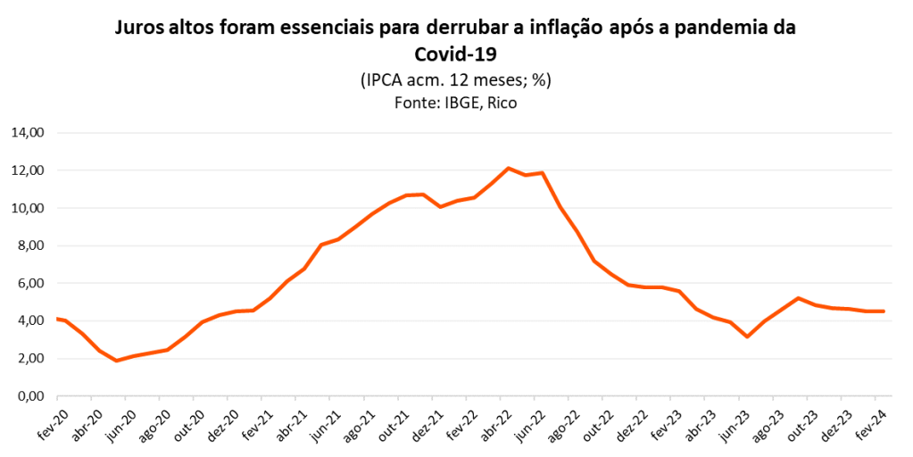 Vale destacar que a própria manutenção dos juros altos por um longo período foi essencial para que a inflação caísse para níveis “mais comportados” ao longo de 2023. Como podemos ver no gráfico abaixo, a inflação medida pelo nosso principal indicador de preços ao consumidor (o IPCA) caiu de 12,1% em abril de 2022 para 4,5% em fevereiro de 2024.