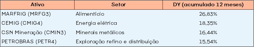 Abaixo, podemos perceber que apenas uma empresa apresentou o DY acumulado nos últimos 12 meses superior a 15% ao ano (1,17% ao mês), ou seja, que superou a taxa Selic:
