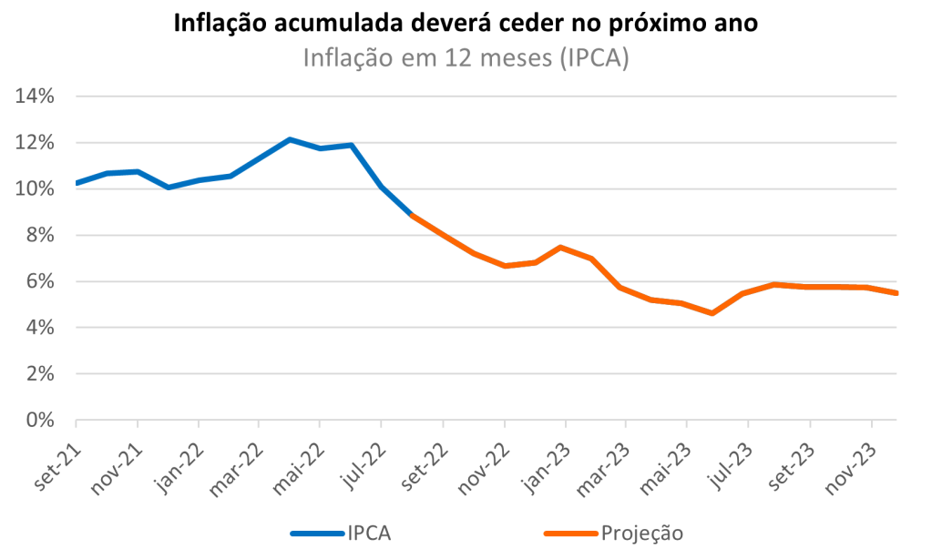 Porém, com os dados de inflação começando a apesentar queda no Brasil, o efeito negativo que isso pode representar para esses fundos começa a se refletir em menor otimismo. Segundo nossas projeções, esperamos uma queda do IPCA ao longo do próximo ano conforme o gráfico a seguir: