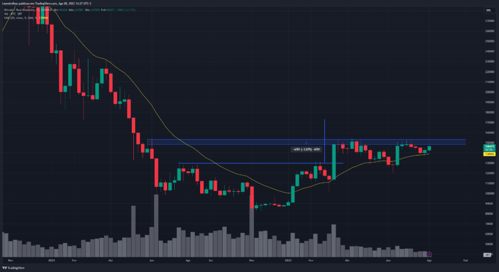A faixa de resistência destacada é relevante e pode frustrar a retomada da alta, mas o eventual rompimento com fechamento acima de R$ 154.000,00 pode desencadear novo movimento com alvo projetado em R$ 172.970,00.