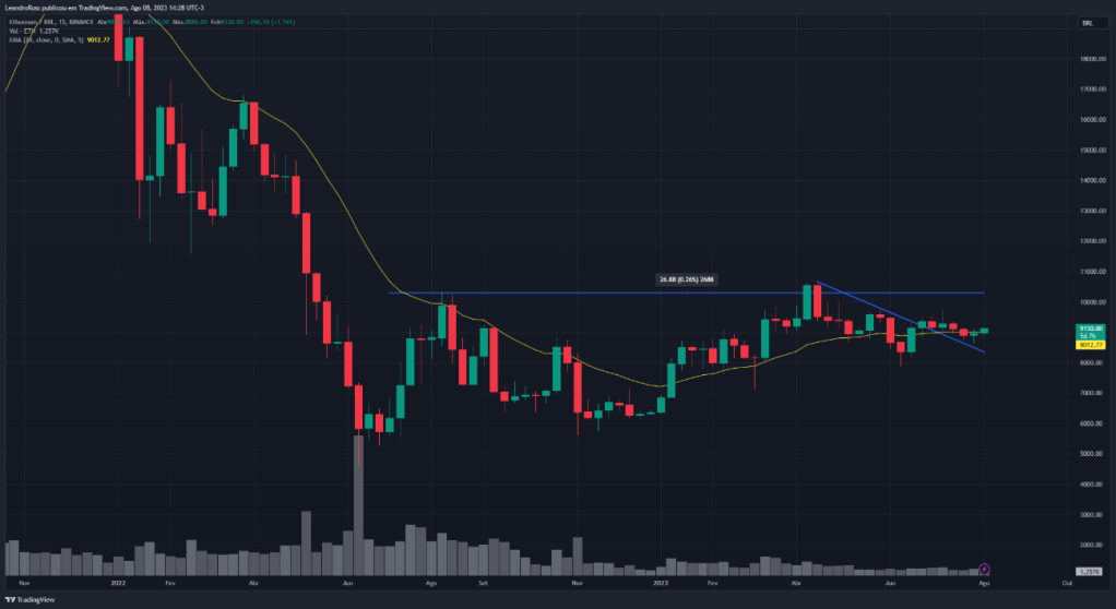 Ethereum negocia próximo a região de resistência de uma grande lateralidade sem qualquer sinal de rompimento evidente. A formação de um fundo mais alto que o anterior, acima de R$ 8.200,00, merece atenção e pode oferecer alguma oportunidade de trade mais agressivo caso sinalize entrada de força compradora acima R$ 9.130,00.