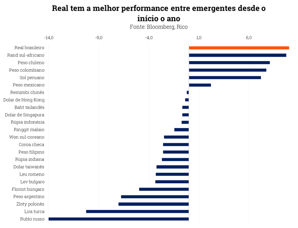 - Pode parecer fake news, mas o real é a moeda que mais valorizou frente ao dólar nesse ano, entre os principais emergentes.