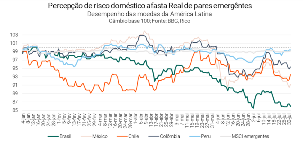 Como ilustrado no gráfico abaixo, essa piora na percepção de risco tem impactado nossa taxa de câmbio, alimentando adicionalmente a desvalorização do real – conforme visto em comparação a outras moedas emergentes.