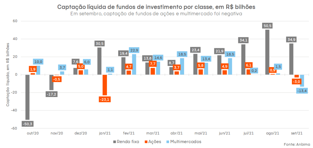 Segundo o relatório de fundos de investimento da Anbima, os fundos de ações e multimercado, que investem parte do patrimônio em renda variável, tiveram captação líquida (total de aportes menos o total de resgates) negativa em setembro, respectivamente de -R$3 bilhões e -R$ 13,4 bilhões. Ou seja, mais dinheiro foi retirado que aplicado nesses fundos durante o mês. Os fundos de renda fixa, por outro lado, tiveram saldo positivo de R$ 34,9 bilhões — o número está com tendência de alta desde o final de 2020.