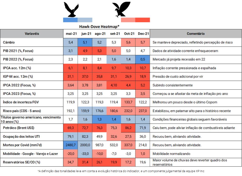 Já os curiosos pássaros estampados no alto indicam uma nomenclatura também curiosa sobre política monetária no mundo: os Hawks (falcões) e os Doves (pombas). Quanto mais vermelho, mais o comportamento do indicador aponta para uma decisão do Banco Central para o lado hawkish; já quanto mais azul, mais o indicador aponta uma decisão para o lado dovish.