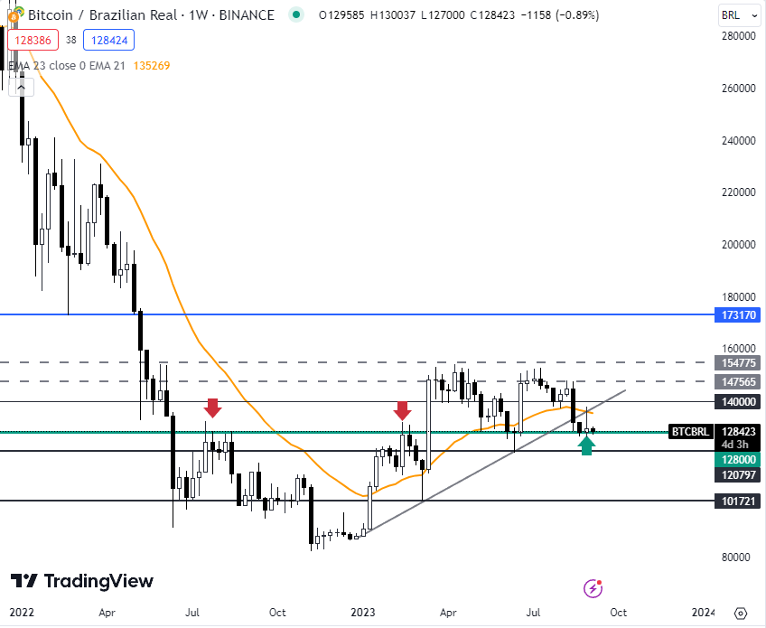 Mesmo com a Grayscale tendo vencido o caso contra a SEC em agosto, o regulador ainda pode recorrer. o movimento de alta não teve fôlego para se sustentar e neste momento o Bitcoin trabalha em região de suporte, perto dos 128mil reais, região onde passa uma linha bipolar (que já foi referência de resistência mas hoje é referência de suporte). Para baixo, os próximos níveis estão na região de R$121mil e R$101.780.