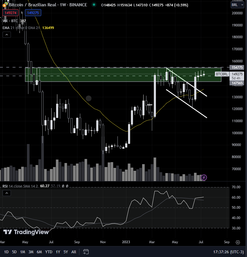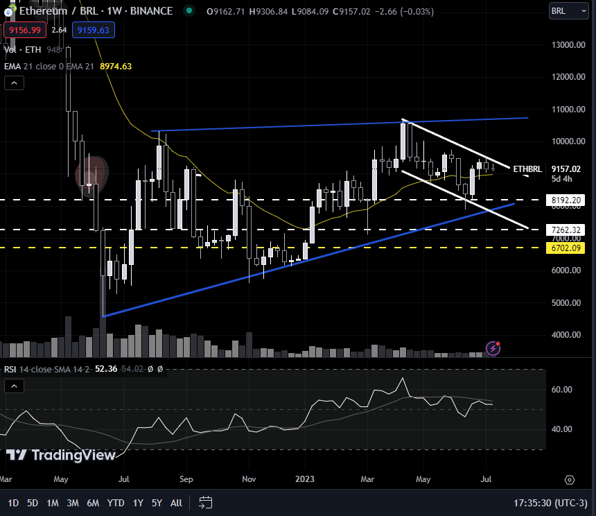Sem grandes alterações de preço e volatilidade comparando a semana passada. O Bitcoin permanece em região de resistência e somente o rompimento da linha de R$154.775,00 poderia trazer um movimento de alta mais expressivo, possivelmente para os testes da região de R$183.000,00. Para baixo, suportes em R$142,420,00 e R$136.780,00.