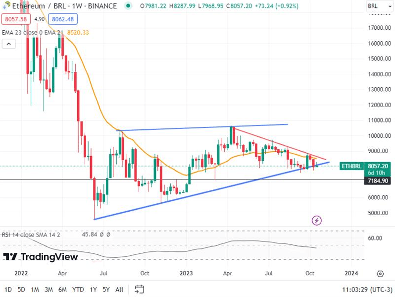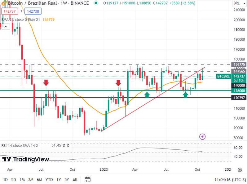 Apresentando grande volatilidade nesta manhã de segunda-feira, Bitcoin registra alta de 3,85% (em dólares) às 10:44am (BRT) e 3,57% de valorização em Reais. Graficamente testou a antiga LTA como resistência e retornou rapidamente para a região de 144mil. No gráfico diário a  média móvel mensal é referência de suporte no curto prazo e o aspecto técnico como está agora começa a deixar sinais interessantes para oportunidades de compra entre 143 mil e 140 mil Reais. Para os que têm mais apetite ao risco de curto prazo, o objetivo de saída é em R$ 150.000 assumindo o risco de perda em R$ 135.100.