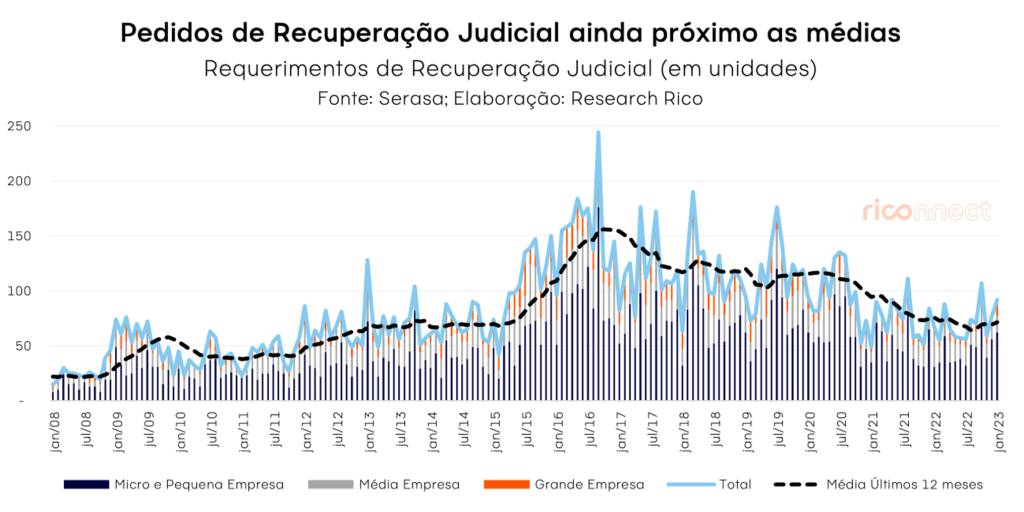 Outro bom sinal é o nível de pedidos de Recuperação Judicial de empresas ainda próximo da média histórica recente, quando analisado desde 2008.
