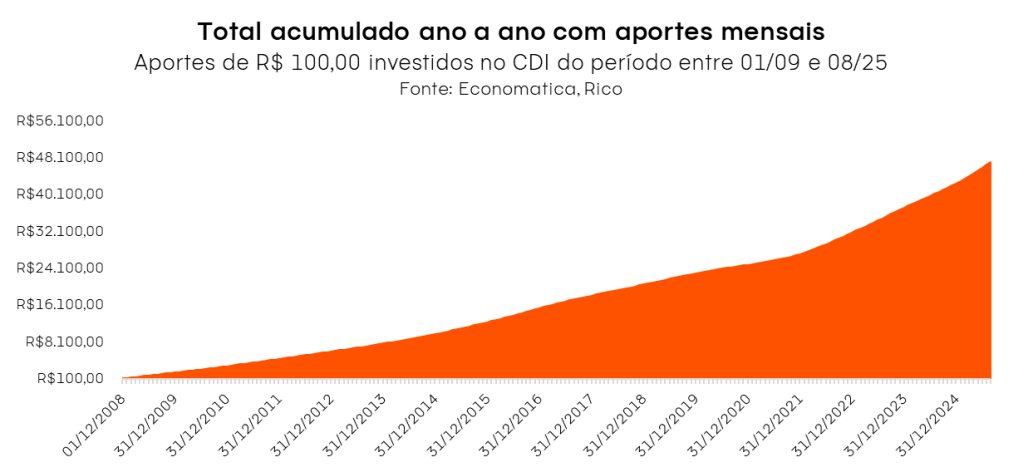 Por exemplo, se seu filho(a) tem o sonho de ir para a Disney em Orlando, imagine o seguinte cenário: se você, pai ou mãe, tivesse começado a investir R$ 100 por mês desde 2009, antes mesmo do nascimento da criança, rendendo o CDI (taxa que é referência para os investimentos e o Tesouro Selic acompanha essa rentabilidade), hoje teria acumulado R$ 46.997,33 sem considerar imposto de renda.