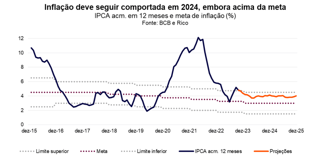 Olhando para frente, o processo de desinflação observado ao longo de 2023 deve continuar em 2024. No mundo, os preços de bens industriais – como carros, eletrodomésticos e máquinas – devem seguir subindo lentamente ou mesmo em queda. O enfraquecimento do preço de commodities industriais, como comentamos acima, explica boa parte dessa dinâmica benigna para a inflação.