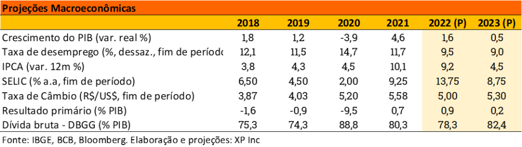 Assim, o PIB deve perder força na segunda metade de 2022, diante da inflação e juros altos no palco doméstico, e da desaceleração das maiores economias do mundo no palco global. Vemos o PIB crescendo apenas 0,5% em 2023.