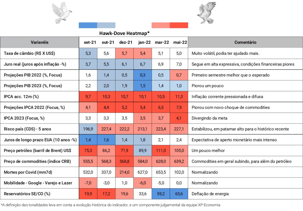 Já os curiosos pássaros estampados no alto do mapa indicam uma nomenclatura também curiosa sobre política monetária no mundo: os Hawks (falcões) e os Doves (pombas). Quanto mais vermelho, mais o comportamento do indicador aponta para uma decisão do Banco Central para o lado hawkish; já quanto mais azul, mais o indicador aponta uma decisão para o lado dovish.