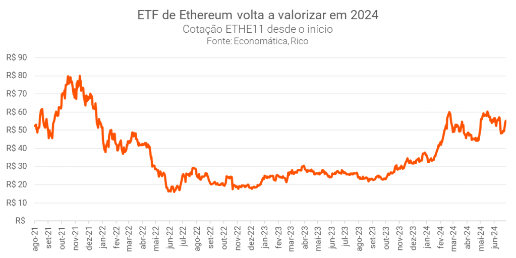 O mesmo ocorre com o ETF do Ethereum, há um gestor que cuida dos recursos desse fundo negociado em bolsa, e os investe diretamente em Ethereum ou em índices que acompanham a cotação dele. Isso permite que os investidores consigam se expor às criptomoedas, com a facilidade de negociação diretamente pela bolsa brasileira.