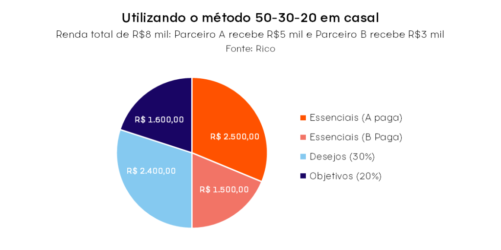 Outra forma eficaz de alinhar as finanças a dois é aplicar o método 50-30-20 à realidade do casal. A seguir, veja como esse método funciona para o cenário em que os gastos essenciais somam R$4.000,00, com a divisão proporcional aplicada a esses custos: