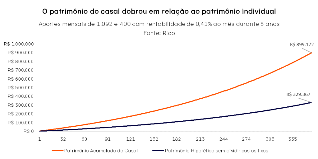Para demonstrar o impacto financeiro de longo prazo gerado pela decisão de dividir despesas e investir o valor economizado, apresentamos a seguir uma projeção comparativa. O objetivo é ilustrar como o casal pode transformar a economia mensal (resultado da vida compartilhada) em patrimônio sólido, se adotarem uma estratégia de investimento disciplinada em suas finanças a dois.