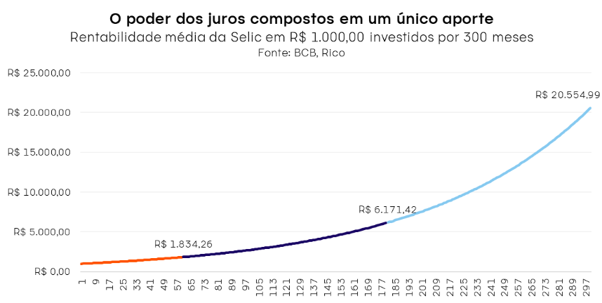 Considere o seguinte exemplo: em 25 anos, um único aporte de R$ 1.000,00 em um investimento de renda fixa atrelado à Taxa Selic, com rentabilidade média anual de 12,84%, teria se transformado em aproximadamente R$ 20.554,99 ao final do período (valor bruto, sem considerar impostos ou taxas).