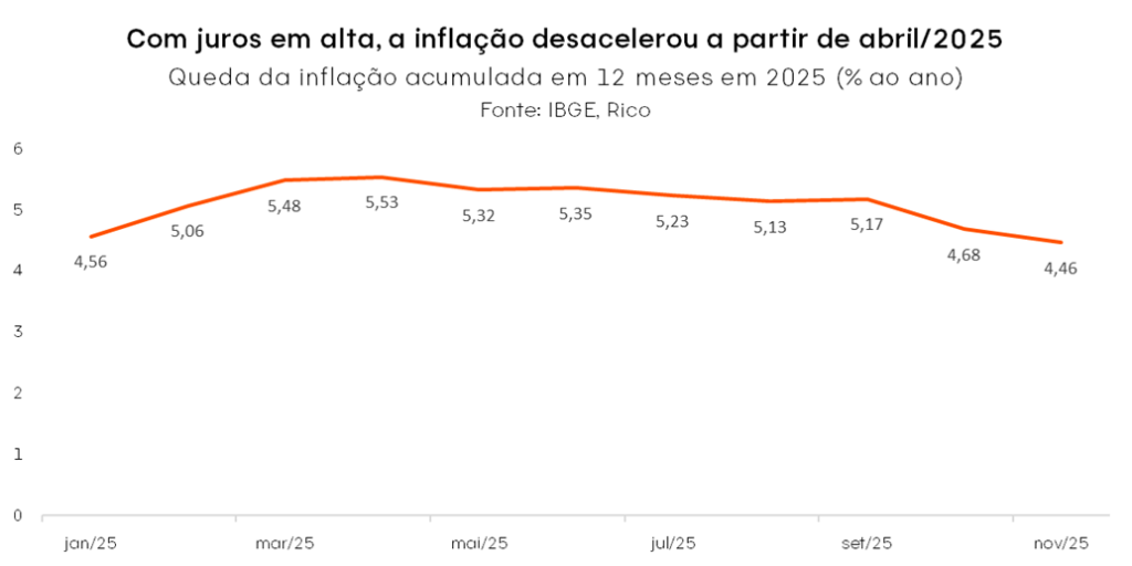 Dito isso, o ano de 2025 foi marcado por um importante processo de desinflação – ou seja, redução no ritmo de alta de preços. Para ilustrar, a inflação medida pelo IPCA (nosso principal indicador de preços ao consumidor) a inflação caiu de 4,87% para 4,46% entre novembro de 2024 e novembro desse ano, considerando a métrica acumulada em doze meses.