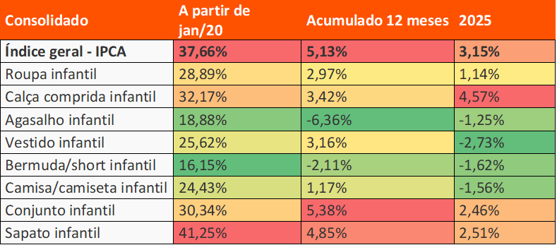 Em síntese, o vestuário infantil ficou abaixo do IPCA desde 2020, pressionado pela alta concorrência e pelo ritmo acelerado de lançamentos, que impulsionaram descontos e uma recomposição seletiva de preços. Já os calçados acompanharam a inflação, sustentados pelo peso dos insumos industriais e por uma demanda de reposição mais consistente.