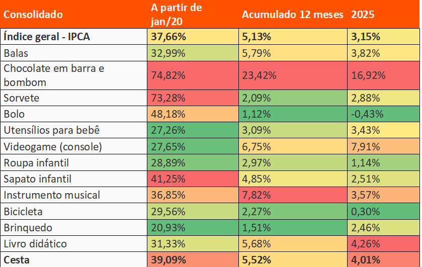 - Os destaques dentro da cesta: enquanto os doces dispararam (+74,8% e +73,3% em cinco anos), os brinquedos e as roupas infantis surpreenderam e aceleraram menos que o índice geral da inflação (+21% e 28,9% em cinco anos).