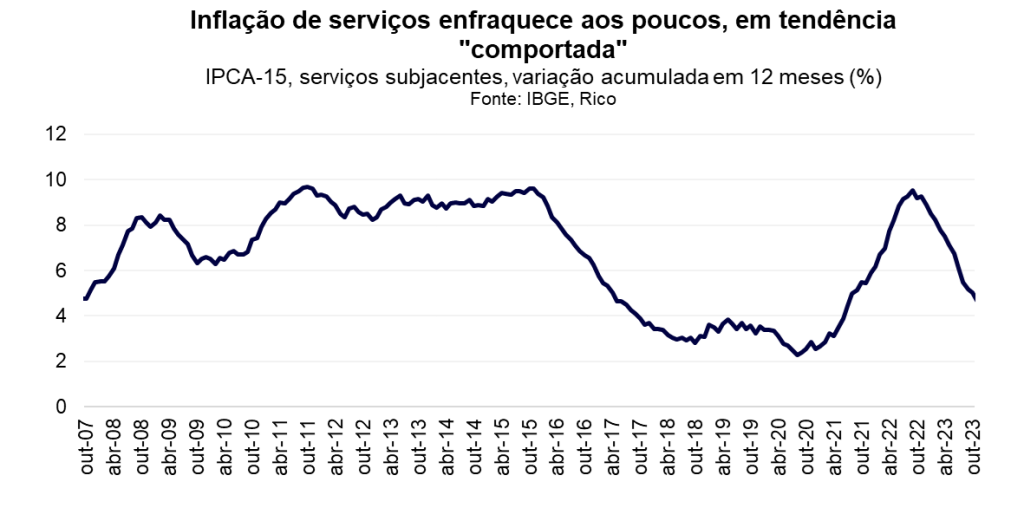 Porém, preços subindo acima da meta do Banco Central, especialmente no setor de serviços, ainda remetem certa cautela. Isso significa que o “segundo estágio” de desinflação está em andamento, mas ainda não foi concluído.