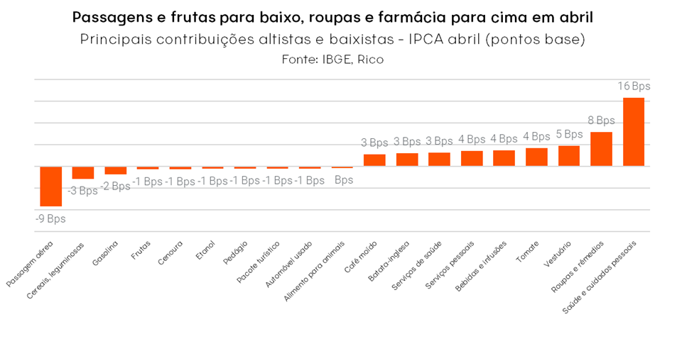 Considerando os detalhes da inflação de abril, vale o destaque para a reversão de descontos da semana do consumidor. O evento, que aconteceu em março e envolveu diversas categorias do varejo, contribuiu para a alta de preços em categorias como “vestuário”, “higiene pessoal” e “aparelhos eletroeletrônicos”. Os preços de medicamentos também foram destaque – mas reajuste anual veio em linha com o esperado. Conforme legislação vigente, os preços de medicamentos foram reajustados em abril, registrando alta de 2,3% no período. Assim, a categoria “saúde e cuidados pessoais” foi a principal contribuição para a elevação do IPCA no mês (respondendo por 15,8 pontos base