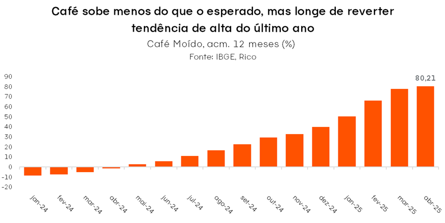 O resultado de abril veio em linha com o esperado pela maior parte dos analistas. O indicador trouxe poucas surpresas, com destaque para preços de café que – para a alegria de muitos – registrou alta um pouco abaixo do esperado no período. (Longe de reverter a forte alta dos últimos meses, que já acumula de 80% ne métrica de 12 meses).