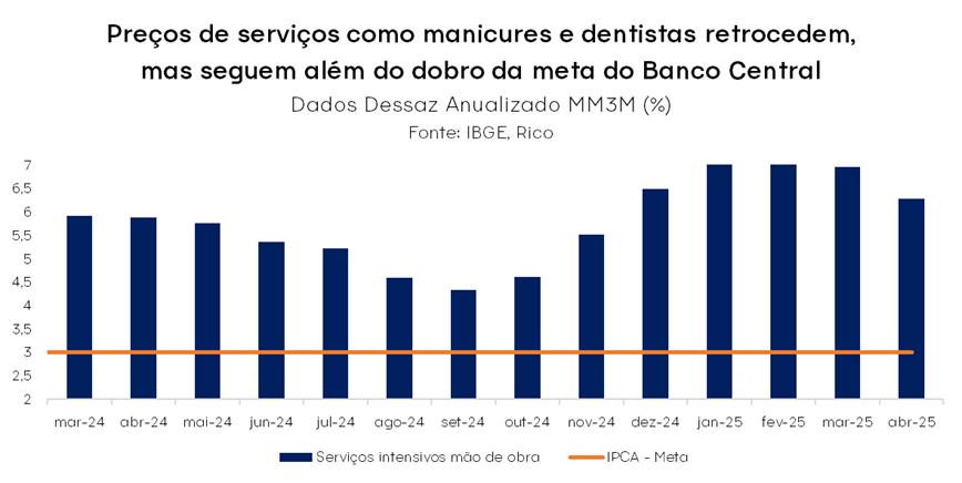 Nesse sentido, vale destacar o comportamento dos preços de serviços intensivos em mão de obra – que inclui serviços como manicures, dentistas e psicólogos. Embora a inflação da categoria tenha trazido leve alívio em abril, desacelerando em relação ao mês anterior, esta segue em patamar além do dobro da meta do Banco Central, em 6,3% (também seguindo a mesma métrica trimestral).