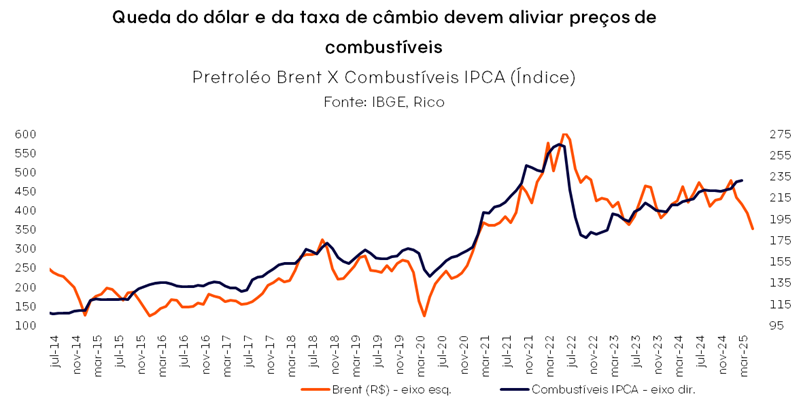 Na mesma linha, a tendência de queda do dólar frente às principais moedas globais (inclusive de emergentes) deve seguir presente, ajudando no controle da inflação por aqui – ao menos nos próximos meses. A mesma incerteza político-econômica nos Estados Unidos explica o movimento recente de depreciação do dólar – como falamos aqui em detalhes – e reduz a pressão tanto sobre preços de bens e serviços importados, quanto de insumos básicos negociados em dólar.
