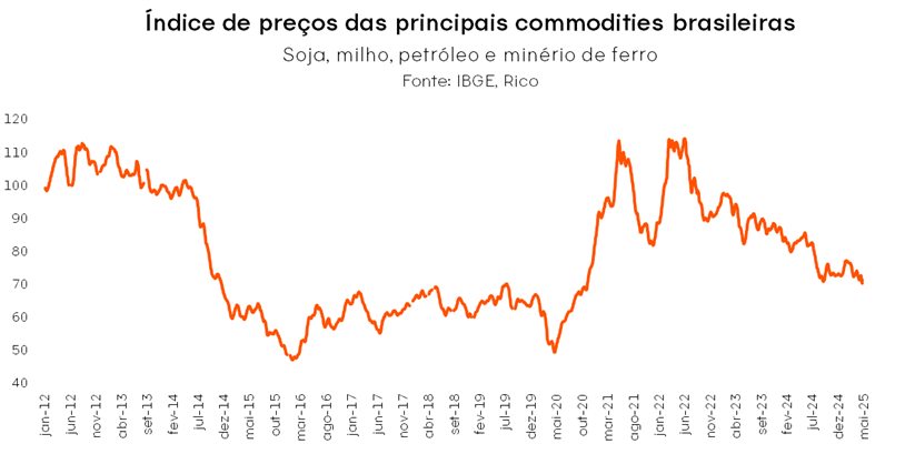 Por outro lado, a conjuntura global pode trazer certo alívio – com destaque para o dólar mais fraco e commodities em baixa. O ambiente de incerteza e instabilidade gerado pelas políticas tarifárias de Donald Trump tem contribuído para deteriorar as expectativas sobre o crescimento econômico no mundo – em outras palavras, o mundo deve crescer menos.
