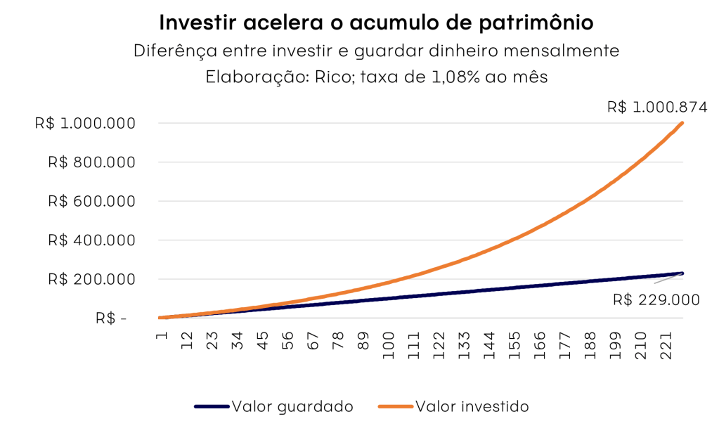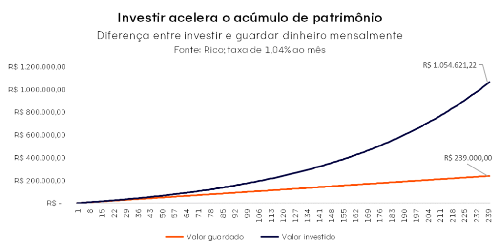 Sim, quem investe ganha tempo! Quando você investe, você faz os juros compostos trabalharem ao seu favor, como demonstramos a seguir ilustrando a diferença entre apenas guardar dinheiro e investi-lo.