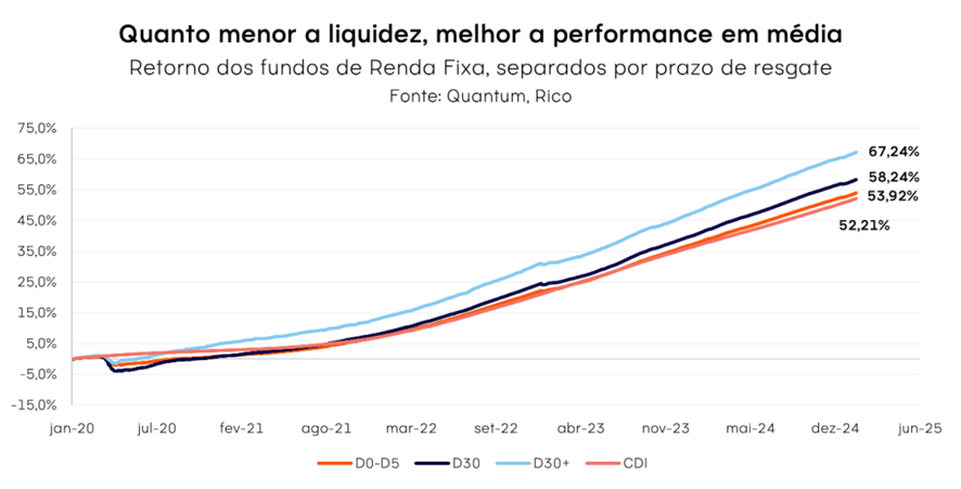 Por outro lado, quando abrimos mão da liquidez, geralmente somos compensados com maiores retornos, o que pode ser interessante para os objetivos de longo prazo. O gráfico abaixo ilustra essa dinâmica em fundos de investimento de renda fixa – como podemos ver, fundos que limitam relativamente mais a saída de investidores (estendendo o prazo de liquidez) tendem a se sair melhor no longo prazo, especialmente em períodos de instabilidades na renda fixa.