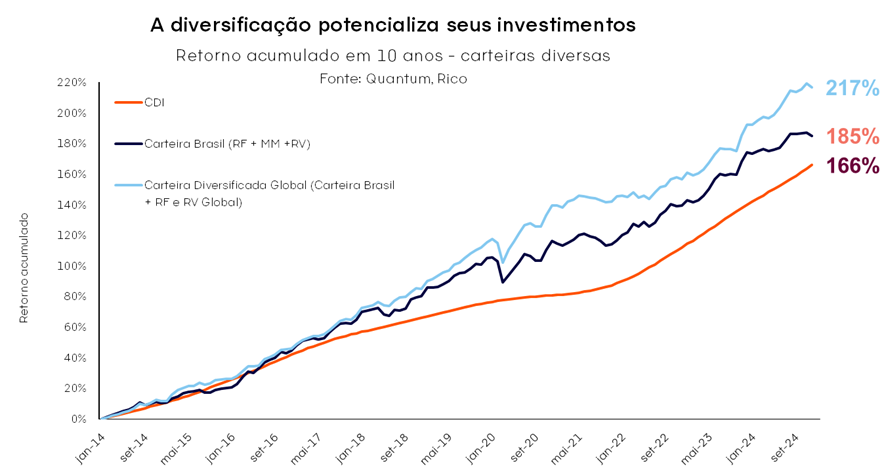 Além disso, quando buscamos objetivos de longo prazo, a diversificação pode trazer mais rentabilidade a uma carteira de investimentos. No gráfico abaixo, mostramos como uma carteira de investimento com uma maior variedade de investimentos apresenta melhor performance ao longo do tempo do que aquelas que incluem uma variedade de investimentos.