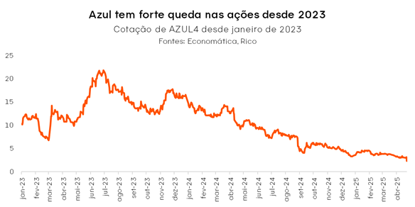 Na última semana, as ações da Azul (AZUL4) sofreram uma queda de mais de 30%. No acumulado do ano, o papel já apresenta uma desvalorização superior a 40%, e em 2024, a queda chegou a impressionantes 77,89%.