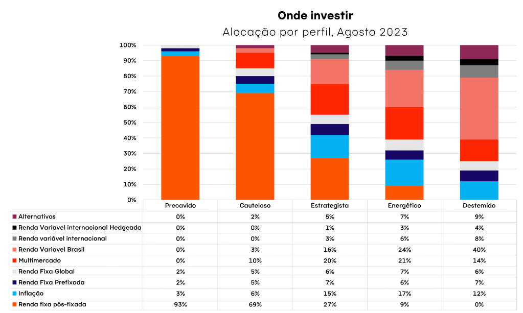 Agora que você já sabe nossa alocação recomendada (o peso de cada classe de ativos ideal para cada perfil investidor nesse momento) e nossa previsão do tempo, separamos algumas sugestões de investimentos recomendados em cada um desses tipos de ativos.