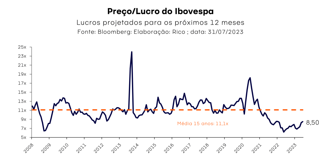 - Nossa bolsa segue “barata” quando comparada ao seu histórico – embora menos descontada após a alta vista nos últimos meses;