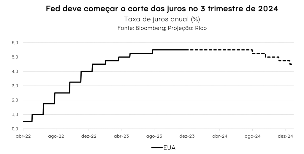 Olhando para os Estados Unidos, apesar da forte alta vista em 2023 nas principais bolsas, acreditamos que a economia já mostra sinais de enfraquecimento, especialmente à medida que empresas começam a sentir o efeito das taxas de juros altas por um período mais longo.
