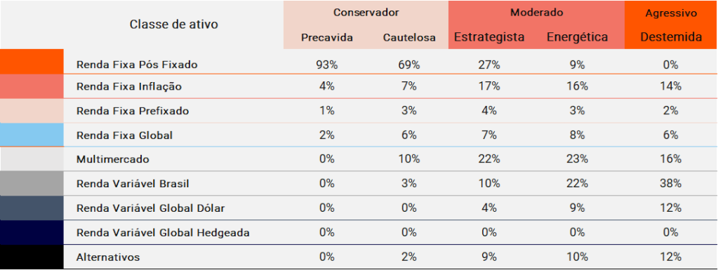 Entenda nossas políticas de investimento aqui. E baixe o PDF da carteira: Precavida, Cautelosa, Estrategista, Energética, Destemida.