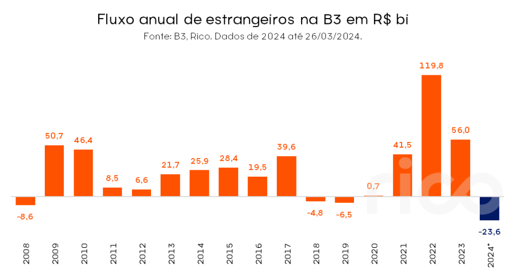 Por aqui, estrangeiros continuam tirando dinheiro da bolsa diante do cenário incerto sobre os juros nos EUA, pressionando para baixo os preços. Para se ter uma ideia, os gringos já retiraram quase R$ 24 bilhões da Bolsa brasileira nesse ano.