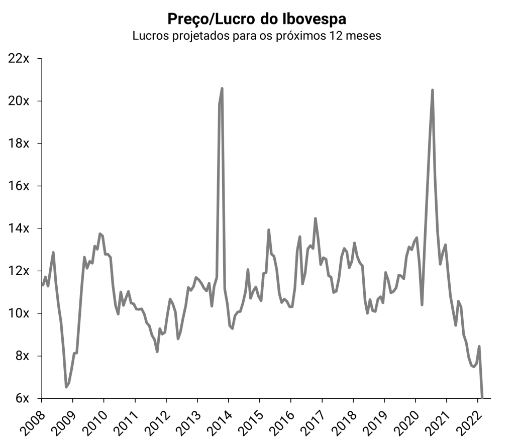 No gráfico acima, percebemos que a bolsa brasileira segue sendo negociada abaixo de seu múltiplo histórico. Enquanto sua média histórica de “preço sobre lucro” é de 11,3x, atualmente está sendo negociada a 6,8x, ou seja, 37% de desconto em relação ao seu histórico.