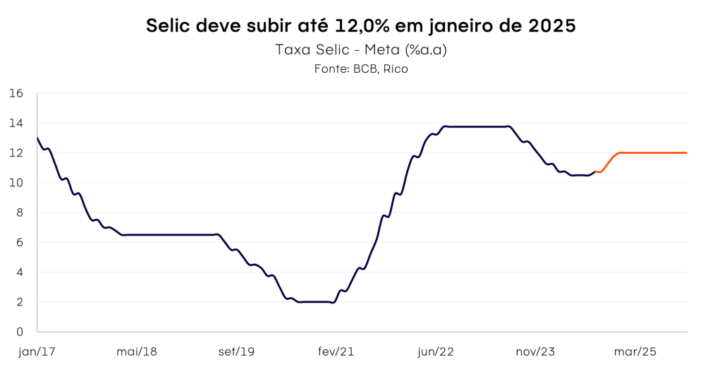 Acreditamos que o Banco Central deverá dar sequência ao ciclo de alta de juros até janeiro de 2025, quando a Selic deverá atingir o patamar de 12,0% ao ano.