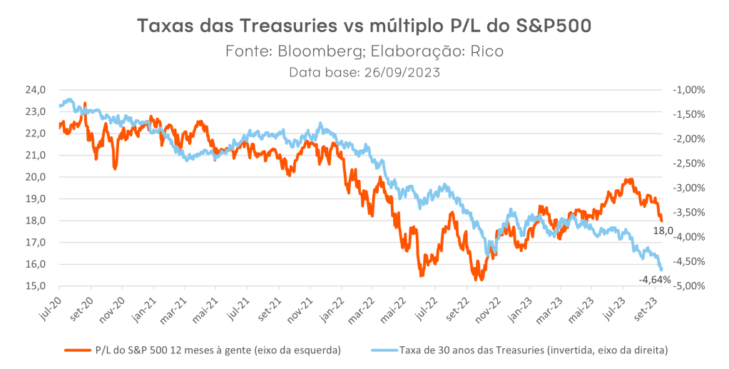 Como falamos, o Banco Central americano (Fed) manteve as taxas de juros nos EUA entre 5,25% e 5,5% em setembro, mas não sem descartar uma postura rígida contra a inflação, nem a possibilidade de mais um aumento adiante.